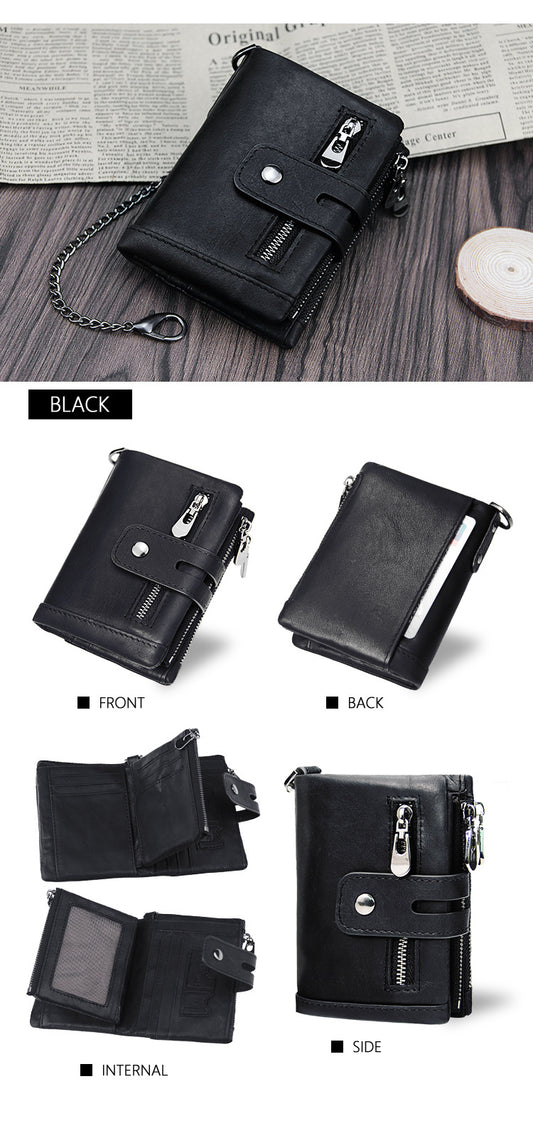 Black Men's Leather Wallet with Zipper and Horse Embossed Design - Compact and Stylish