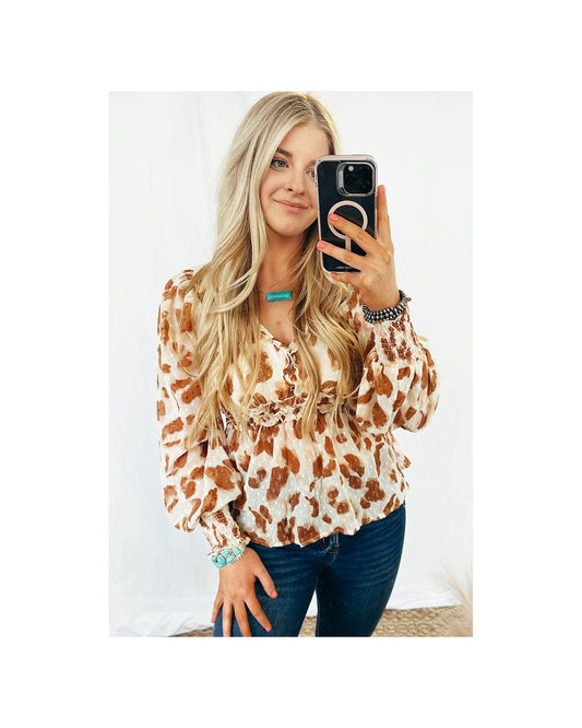 Azura Exchange Leopard Jacquard Puff Sleeve Peplum Blouse - S
