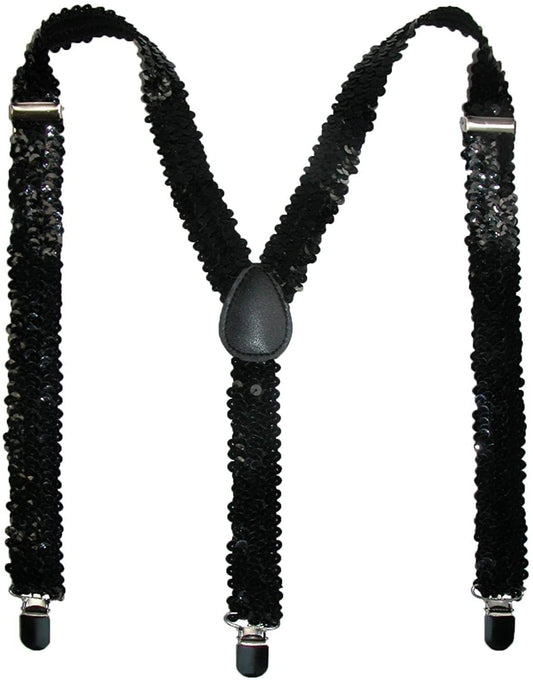 SEQUIN SUSPENDERS Unisex Adjustable Braces Clip On Elastic Y-Back - Black