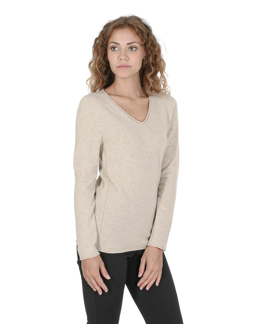 Crown of Edinburgh Cashmere Women's Premium Italian Cashmere V-Neck Sweater in Beige - 46 EU