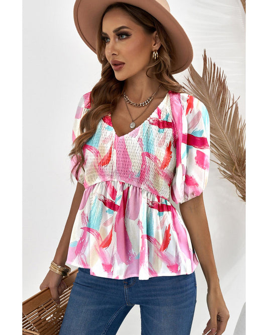Azura Exchange Puff Sleeve Peplum Top with Abstract Print - S