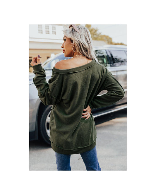 Azura Exchange Exquisite Green Long Sleeve Top with Split Neck and Exposed Seam Detail - L