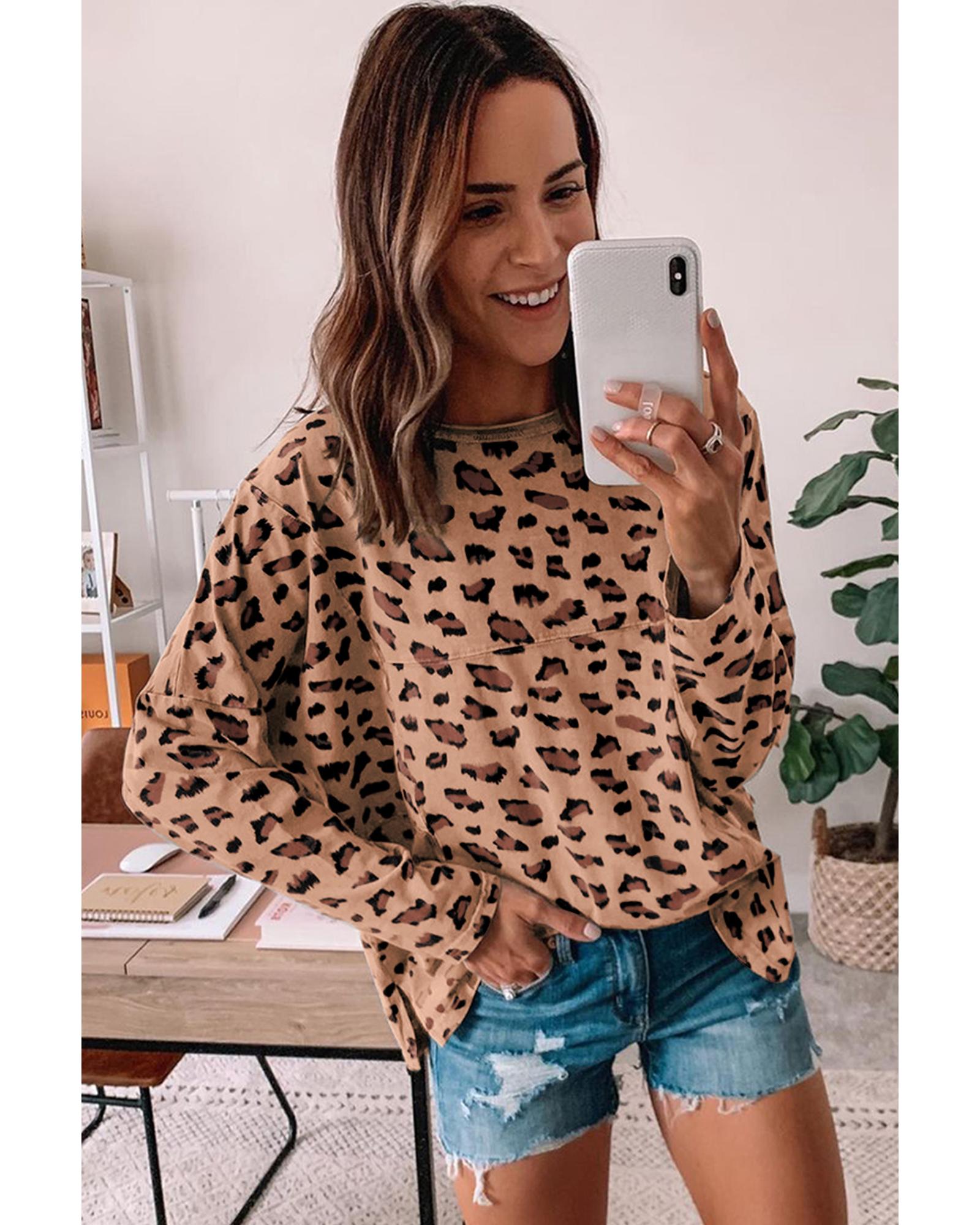 - Brown Animal Print Stitching Loose Long Sleeve Top