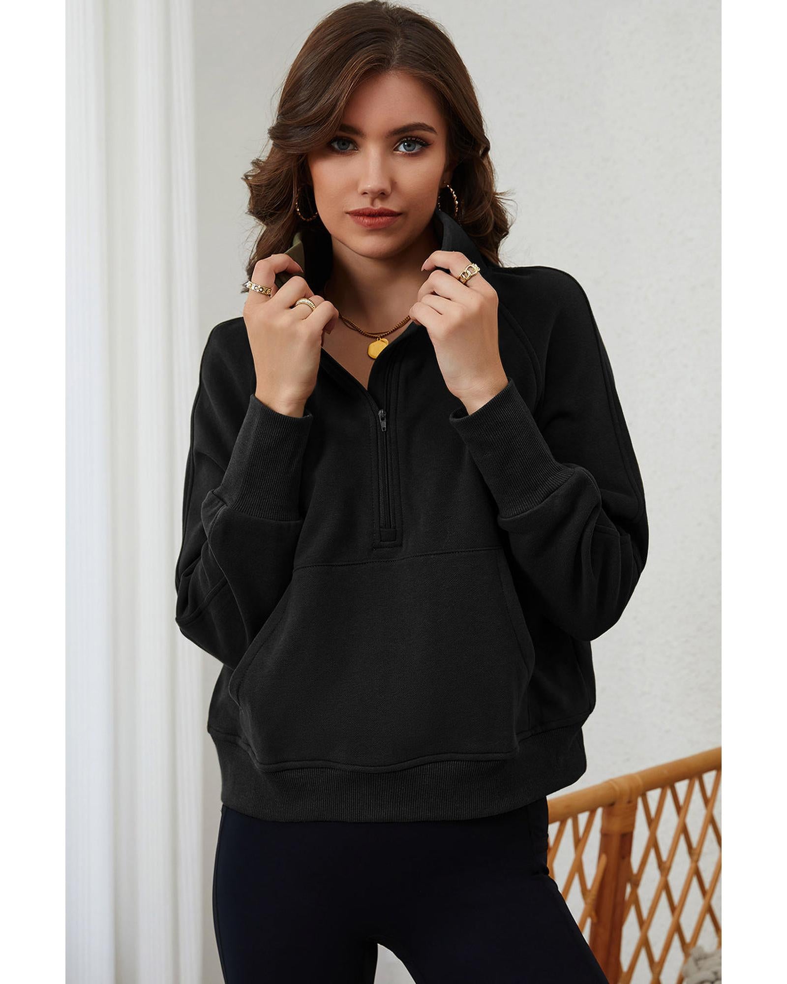 - Black Zip Up Stand Collar Ribbed Thumbhole Sleeve Sweatshirt