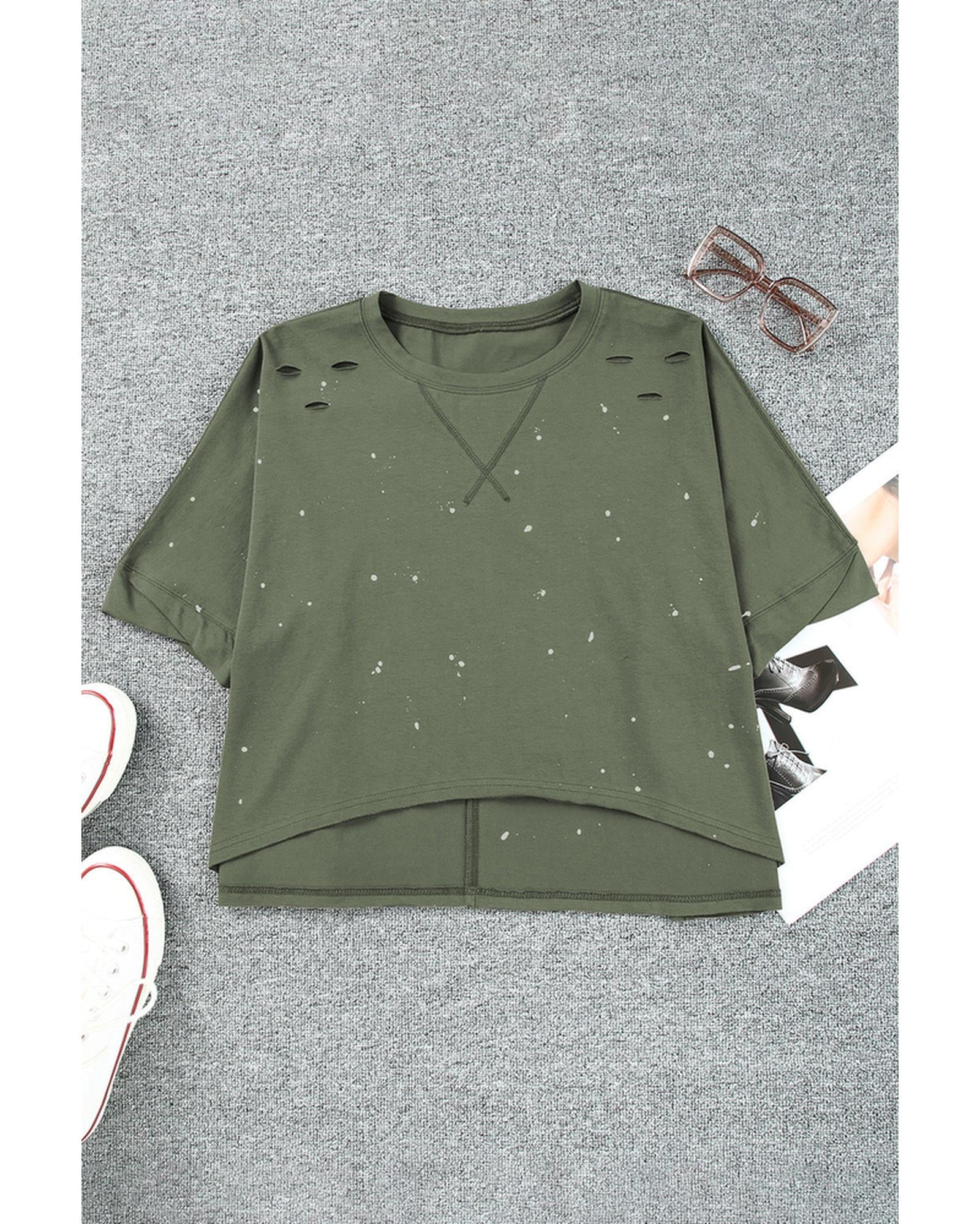 - Stylish and edgy Distressed Bleached Asymmetric Hem Short Sleeve Top