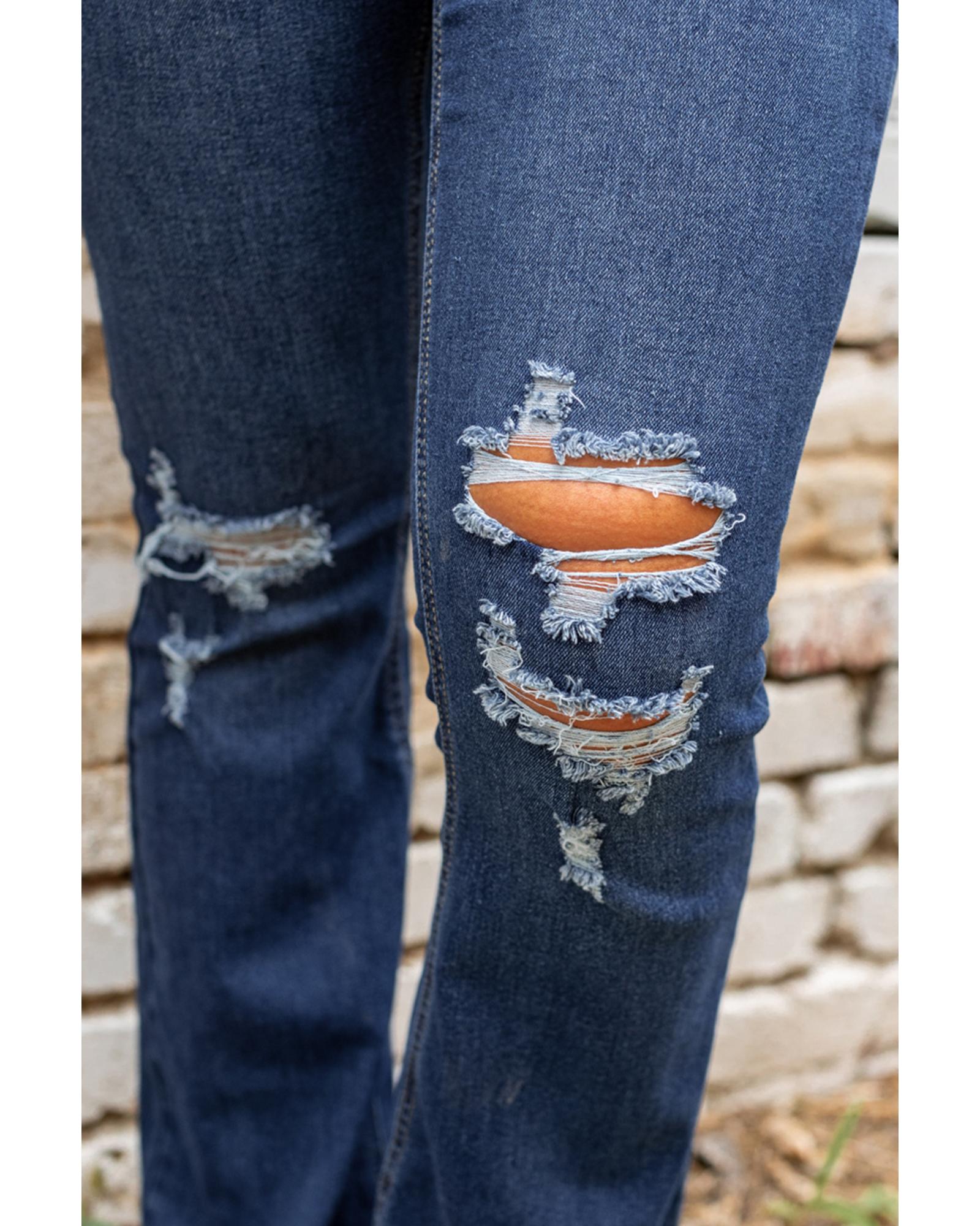 - Trendy and edgy Dark Washed Distressed Flare Bottom Jeans