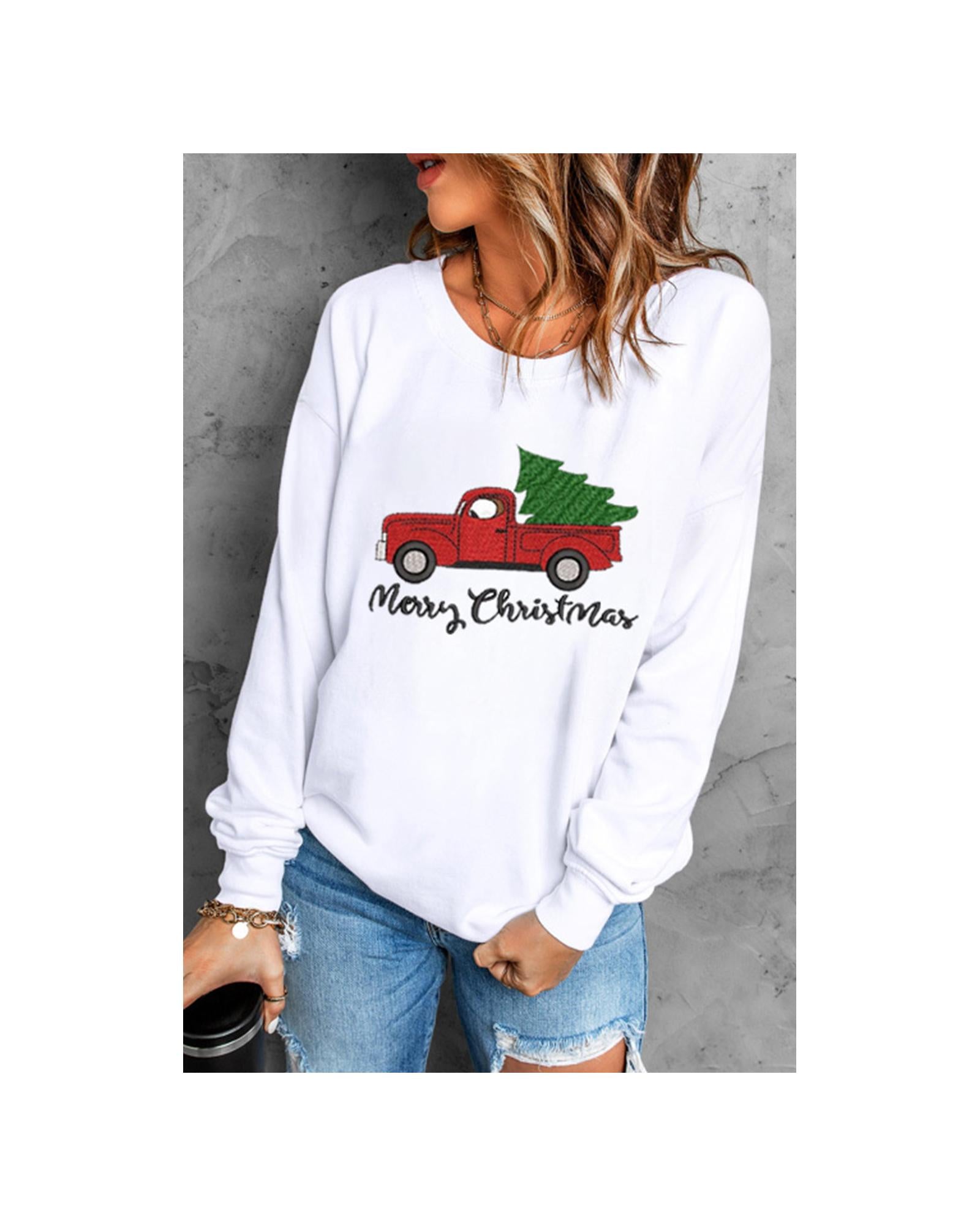 - Merry Christmas Truck Pattern Embroidered Pullover Sweatshirt