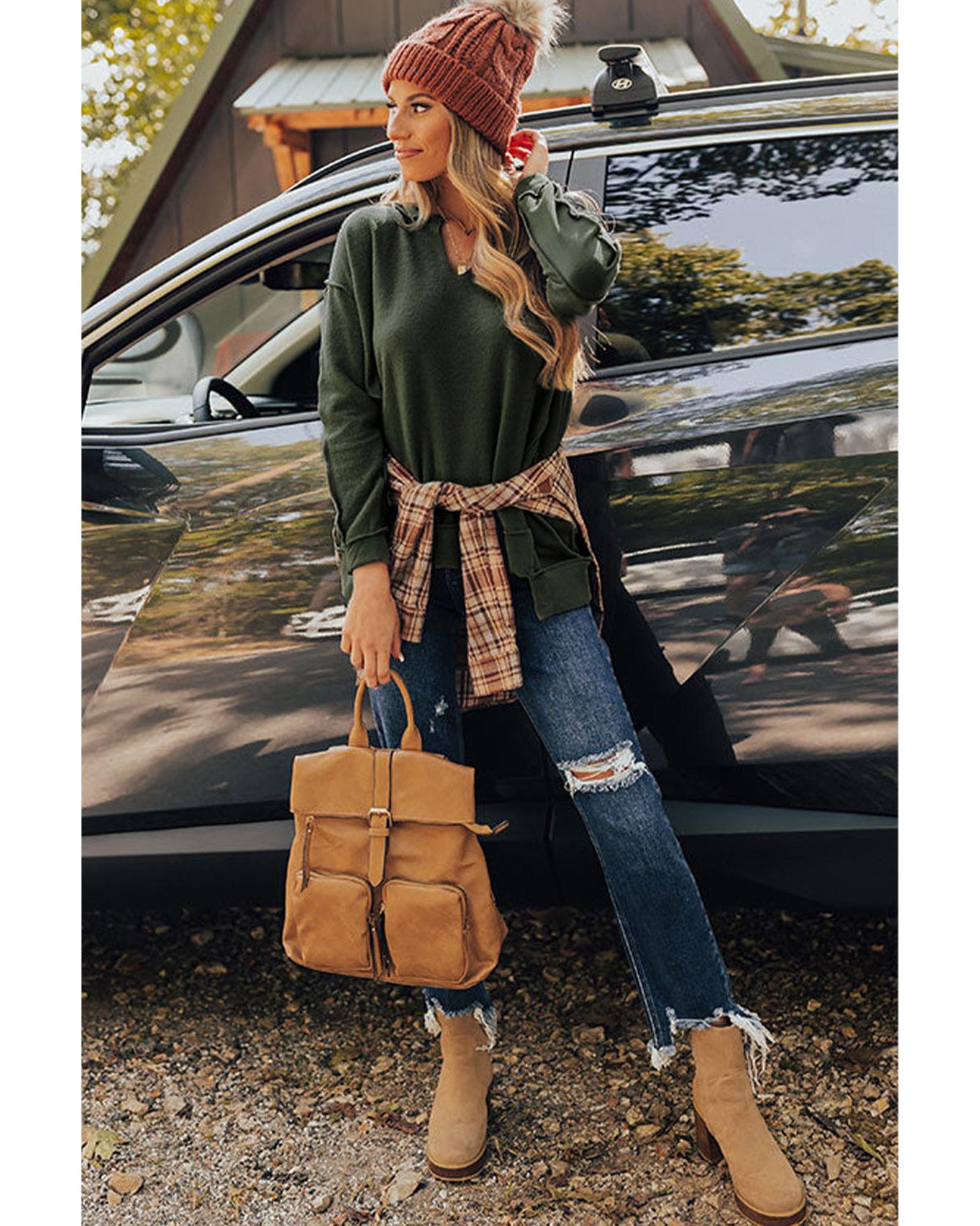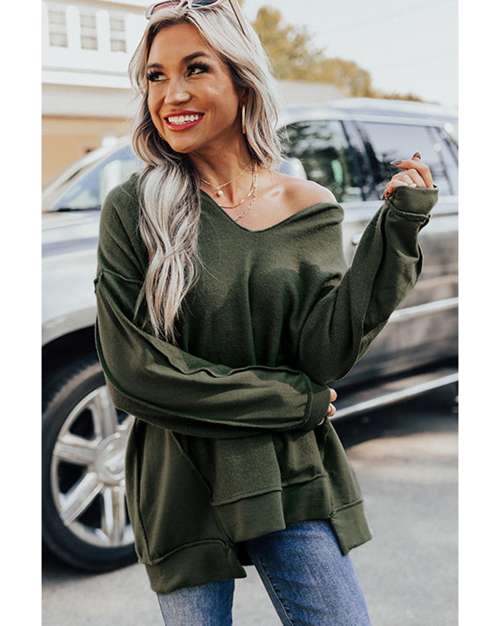 Azura Exchange Exquisite Green Long Sleeve Top with Split Neck and Exposed Seam Detail - L