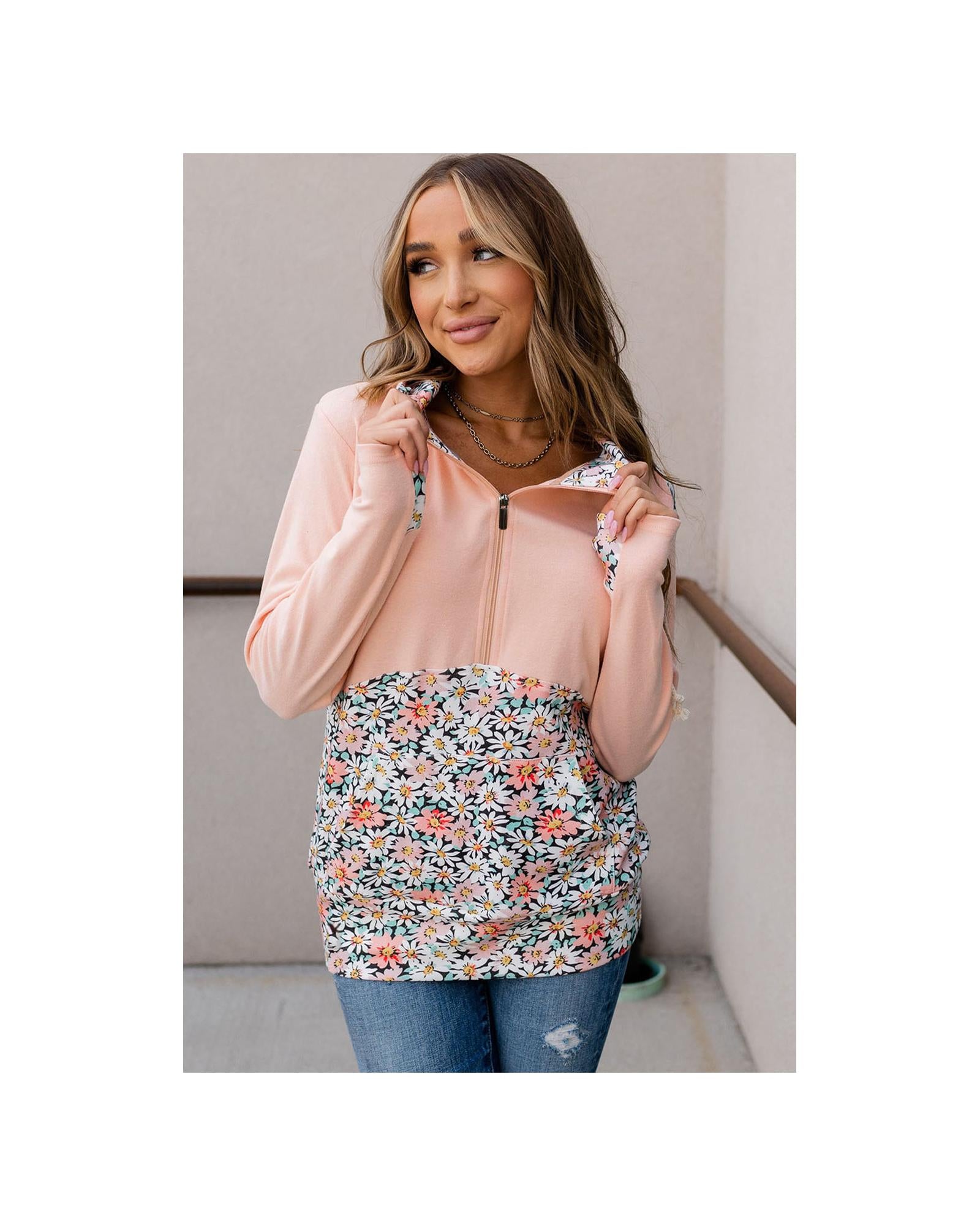 - Pink floral patch half zip hoodie