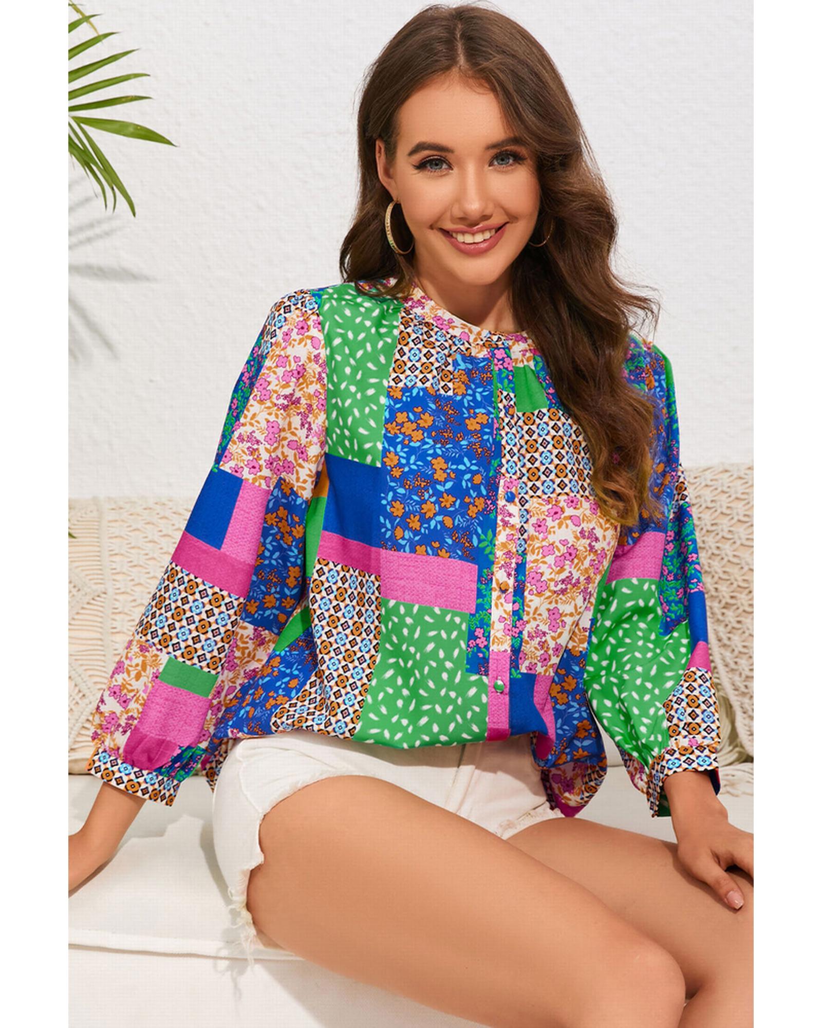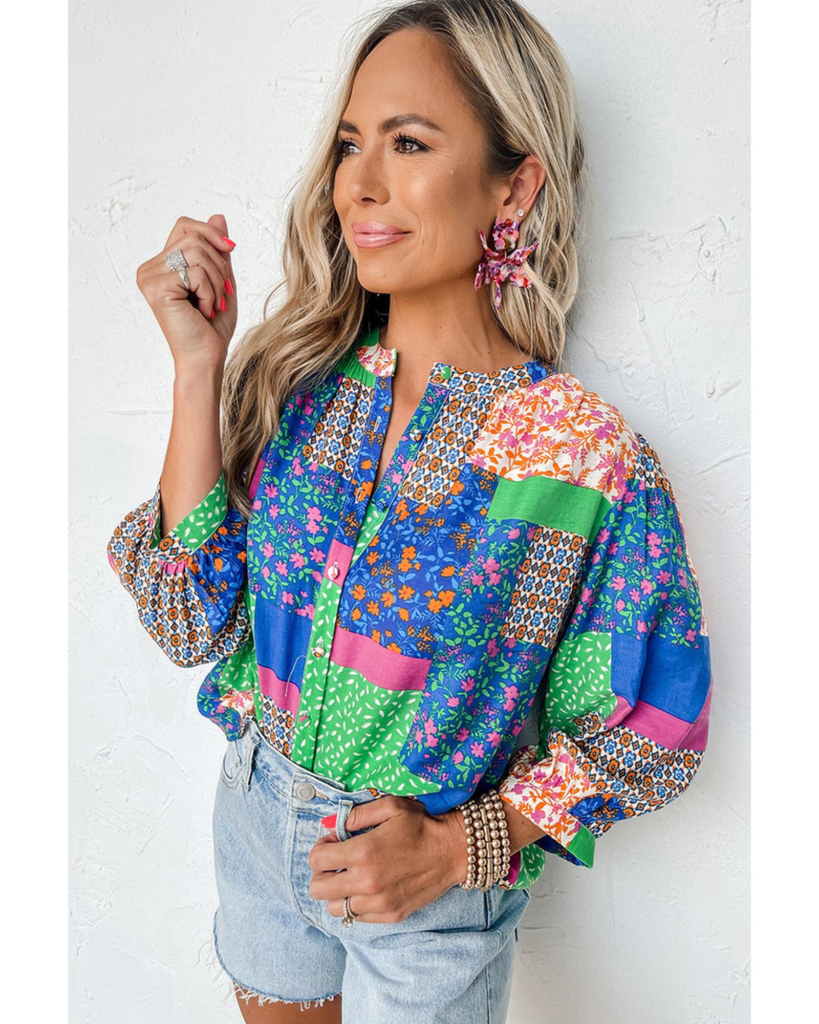 Azura Exchange Floral Patchwork Print Puff Sleeve Shirt - M