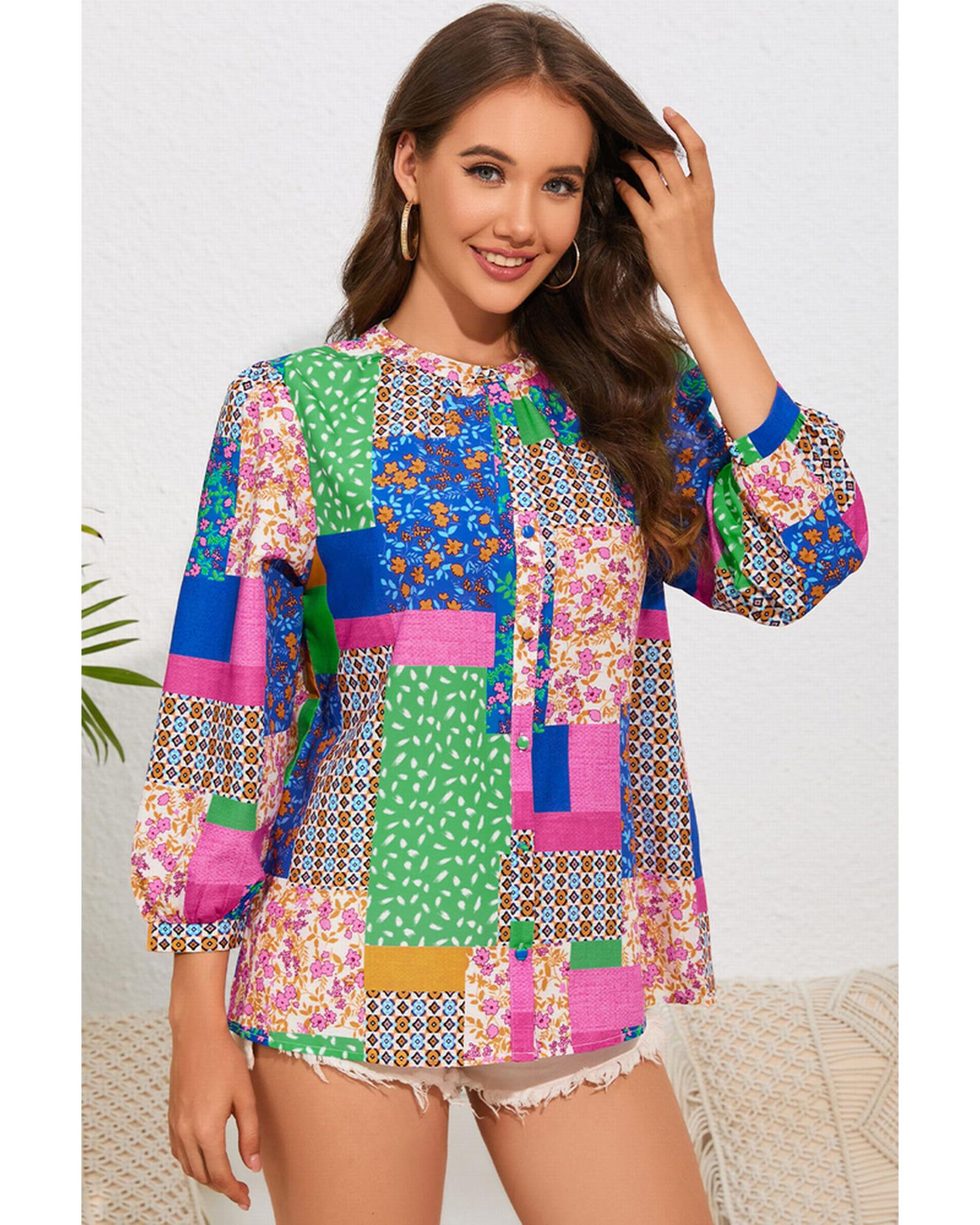 Azura Exchange Floral Patchwork Print Puff Sleeve Shirt - S