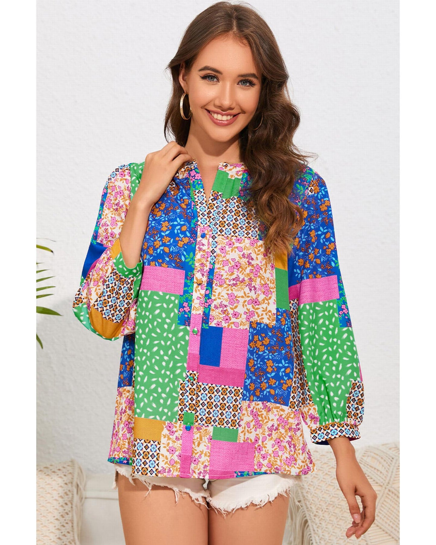 Azura Exchange Floral Patchwork Print Puff Sleeve Shirt - XL