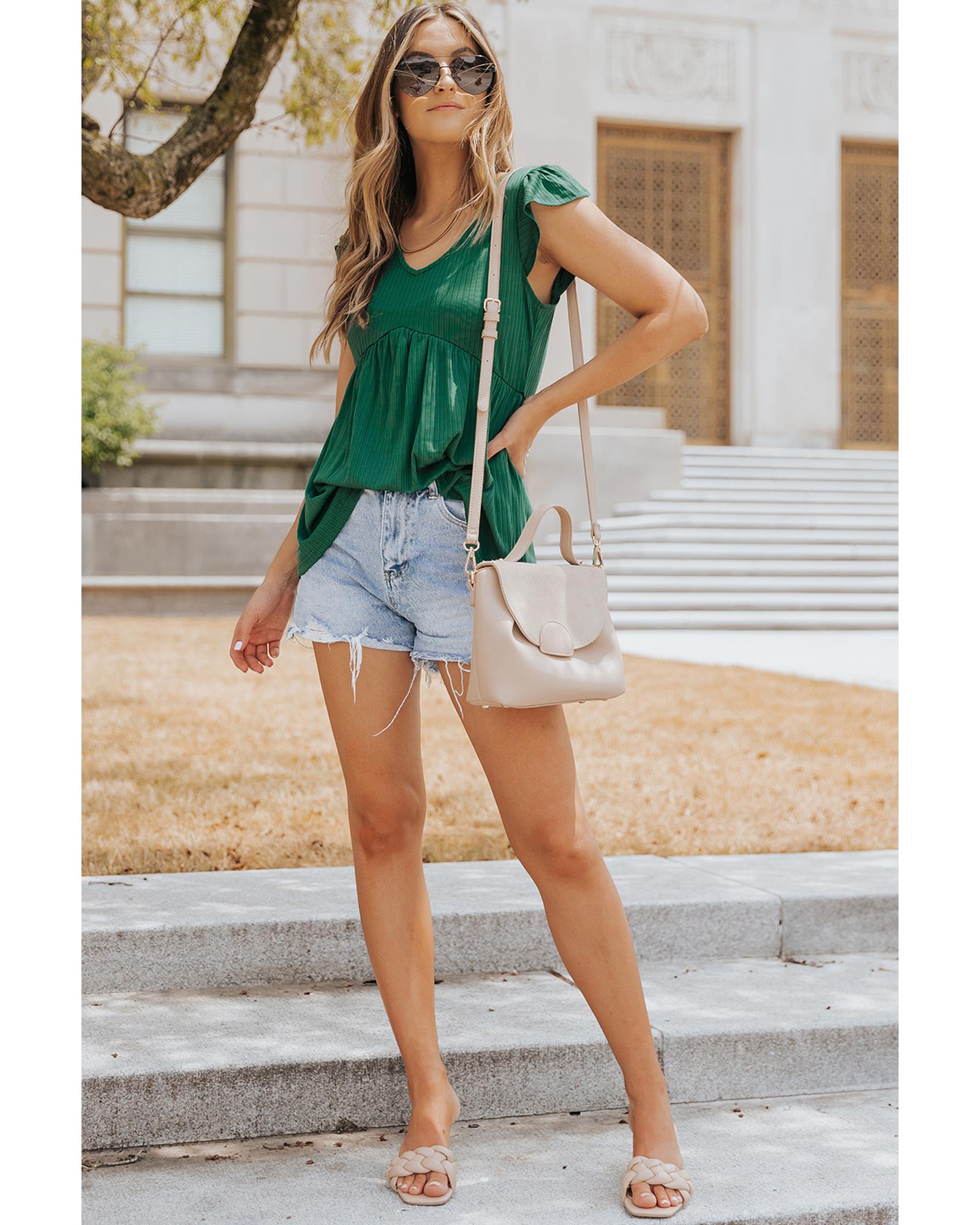 - Luxurious Ribbed Flounce Sleeve V Neck Babydoll Top