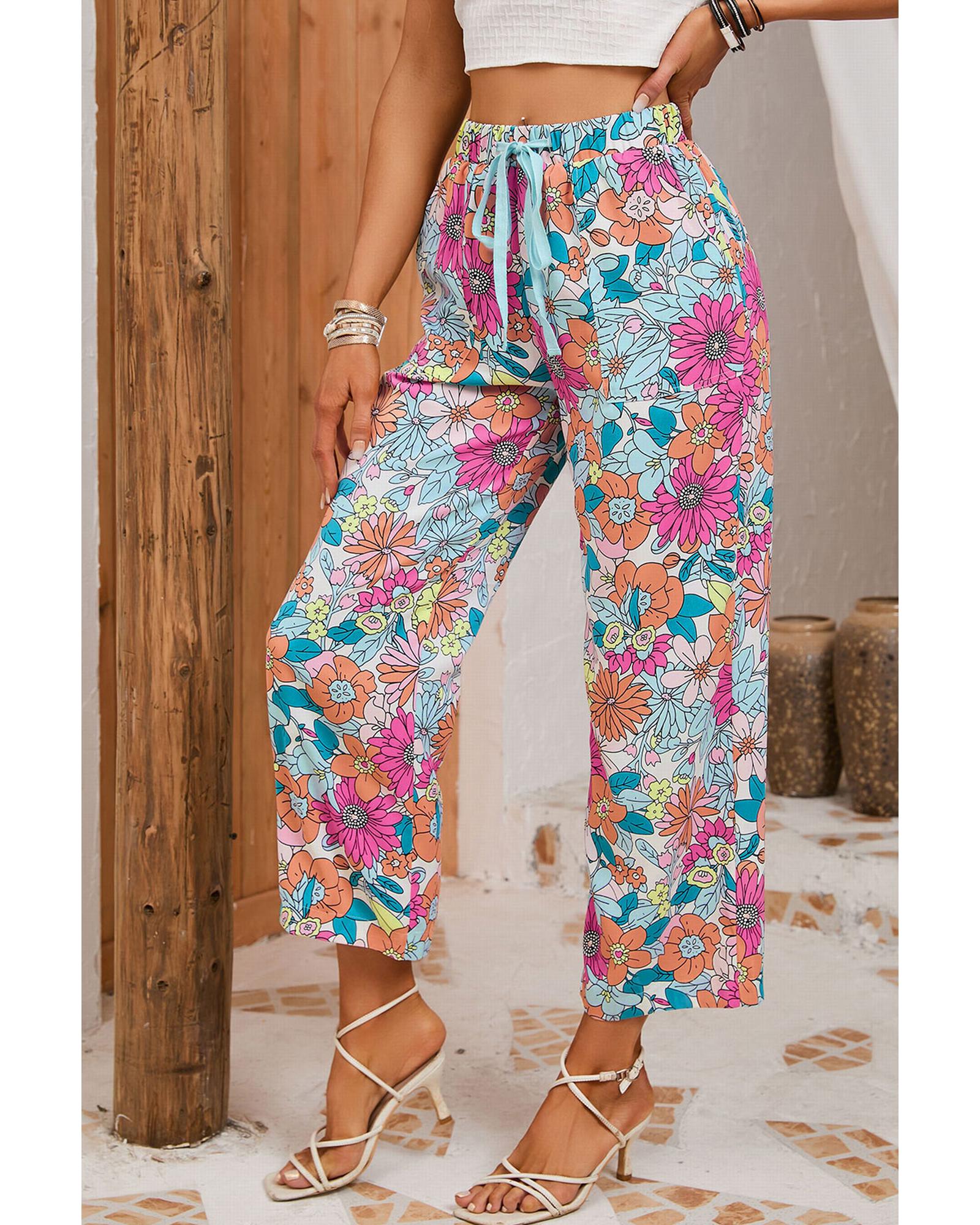 - Multicolor Flower Print Pocketed Drawstring Waist Wide Leg Pants