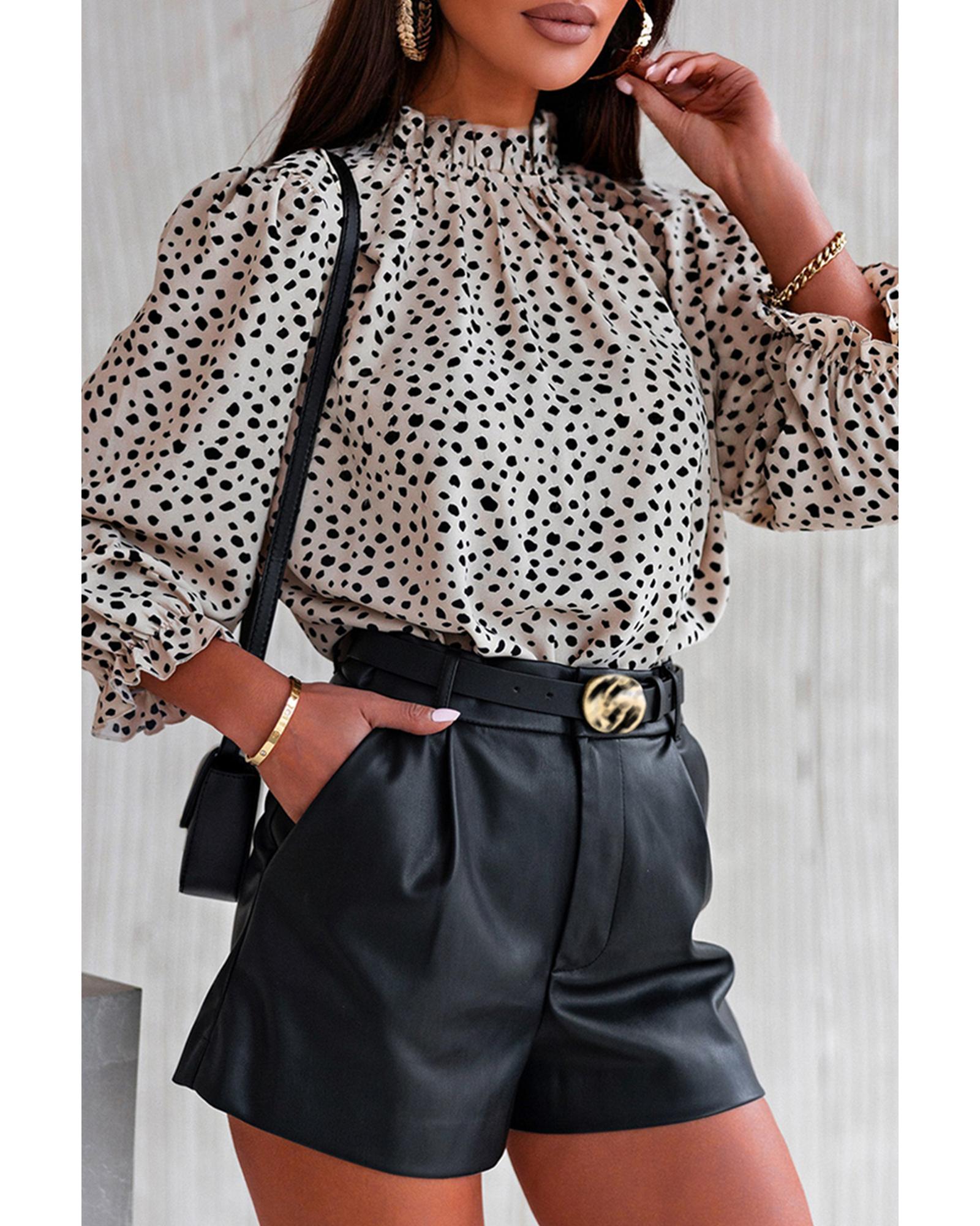 - Khaki Frilled Neck 3/4 Sleeves Cheetah Blouse