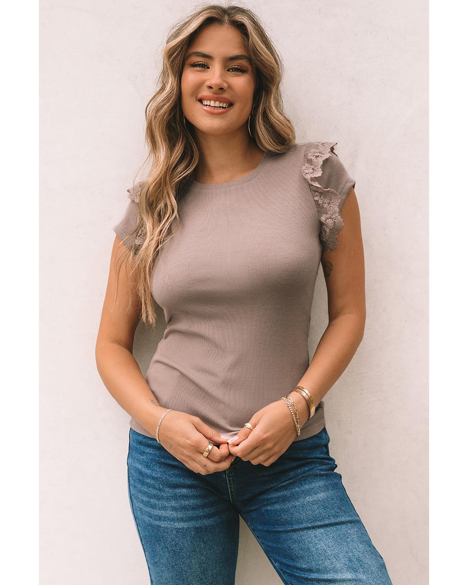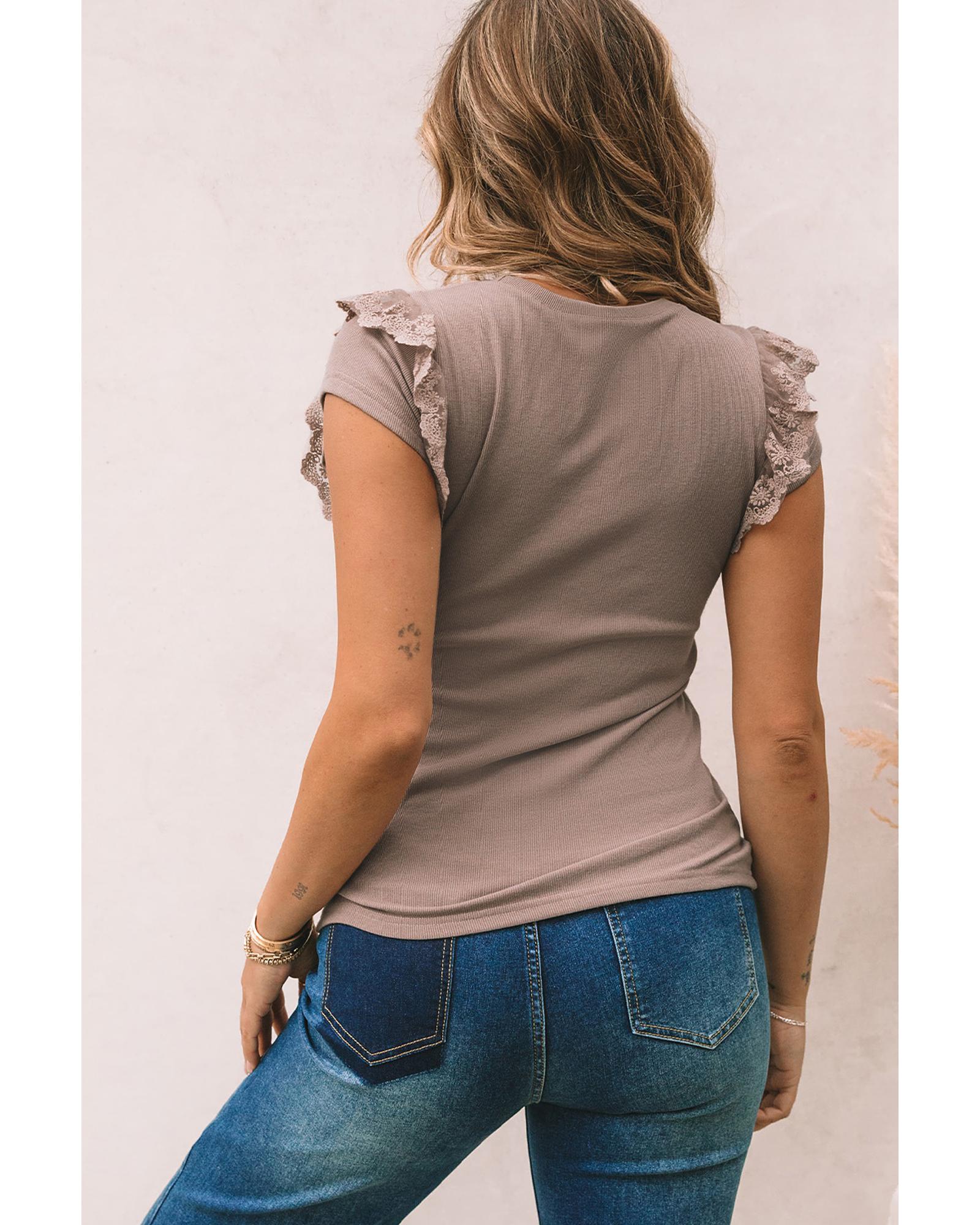 - Khaki Lace Patchwork Ribbed Slim Fit Short Sleeve T Shirt