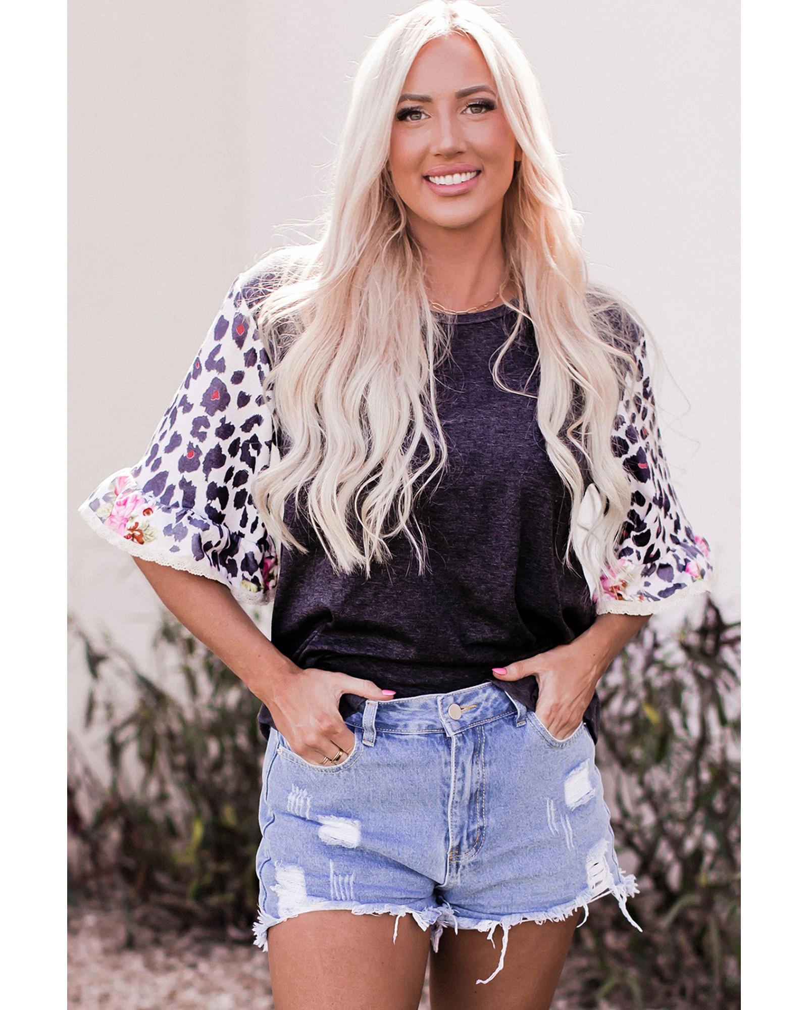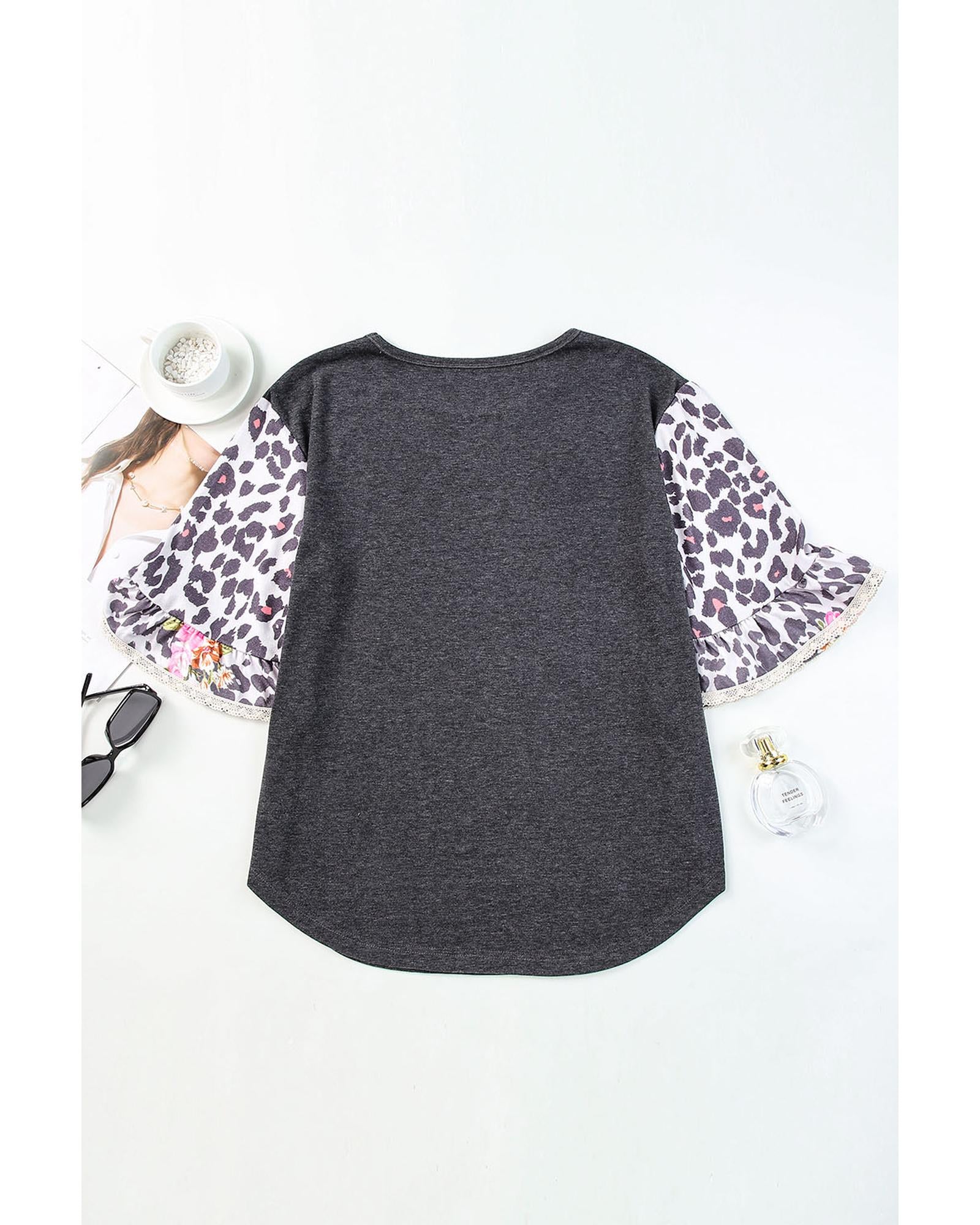 Azura Exchange Leopard Floral Patchwork Ruffle Bell Sleeve Top - S