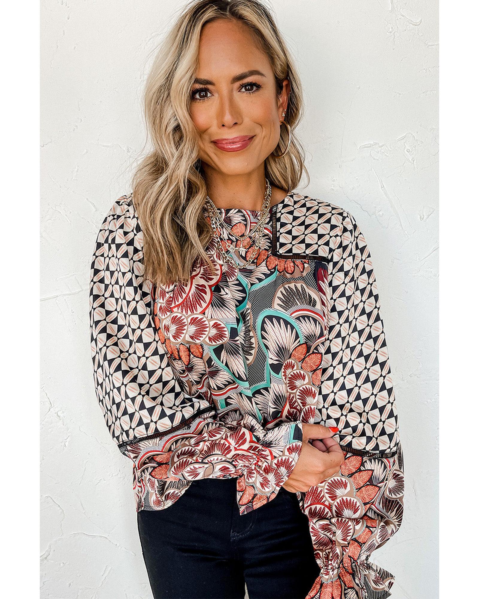 - Luxurious and stylish Black Mixed Floral Geometric Print Ruffled Long Sleeve Blouse