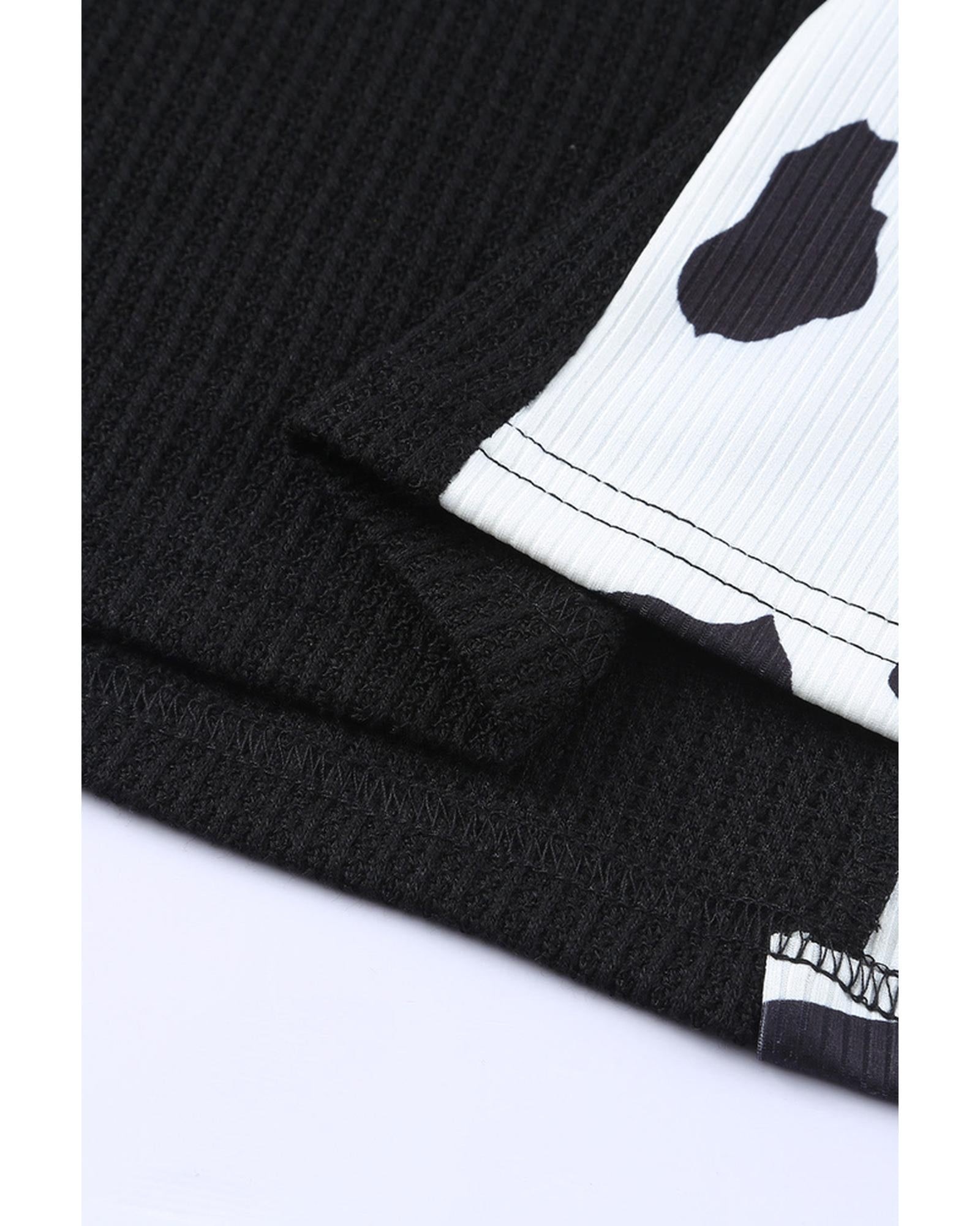 - Cow Patchwork Waffle Knit Long Sleeve Top