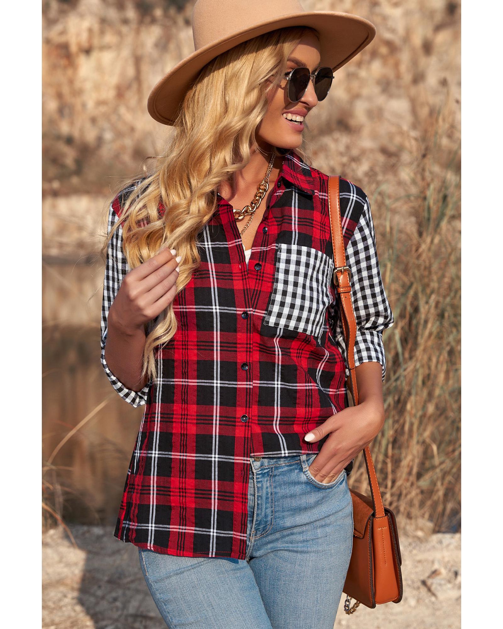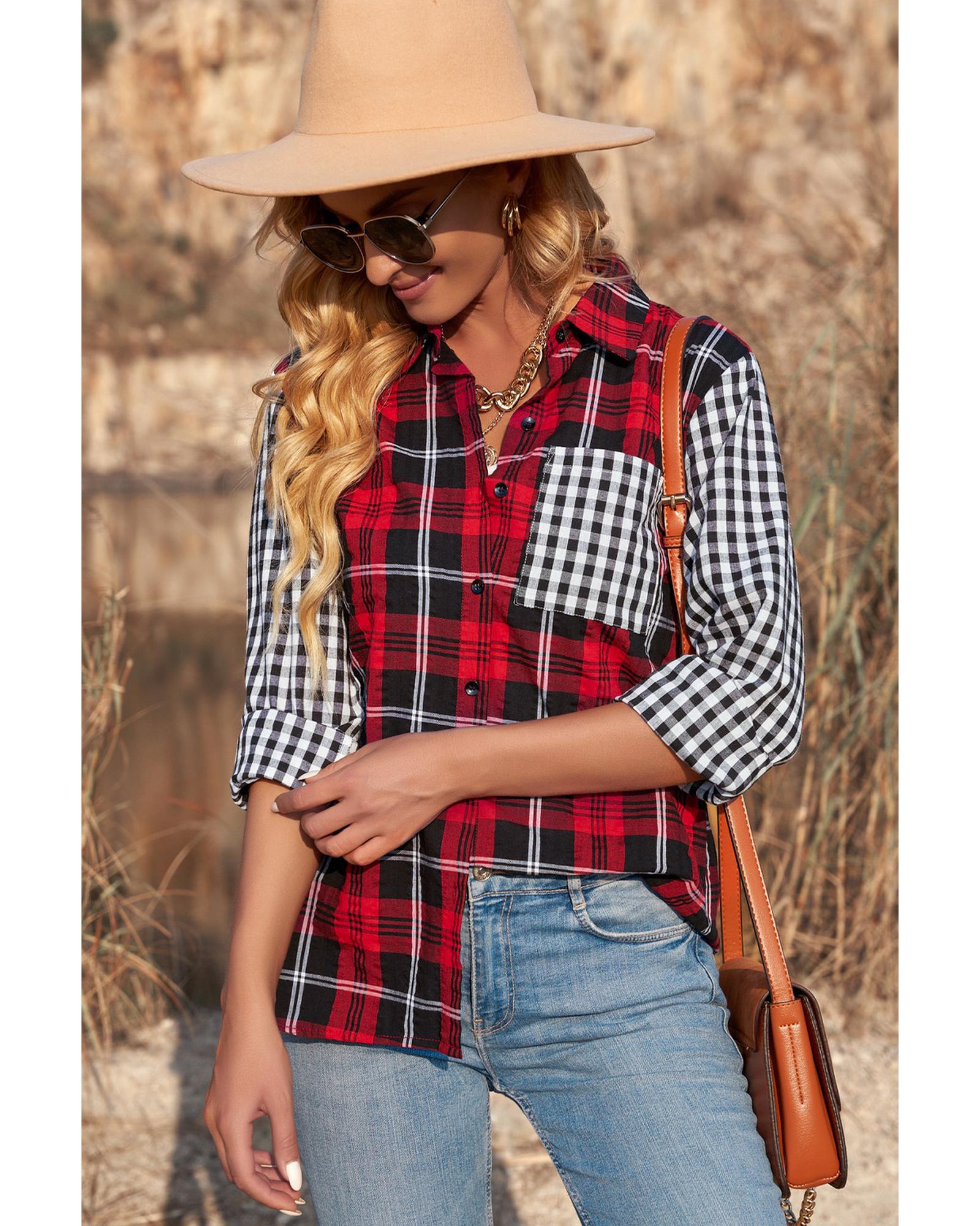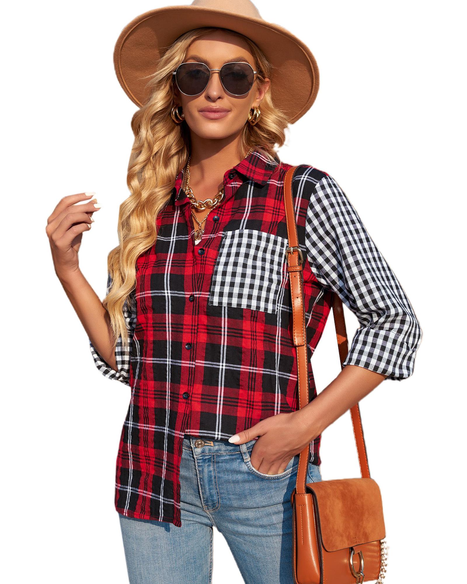 - Stylish and versatile plaid splicing hit color shirt