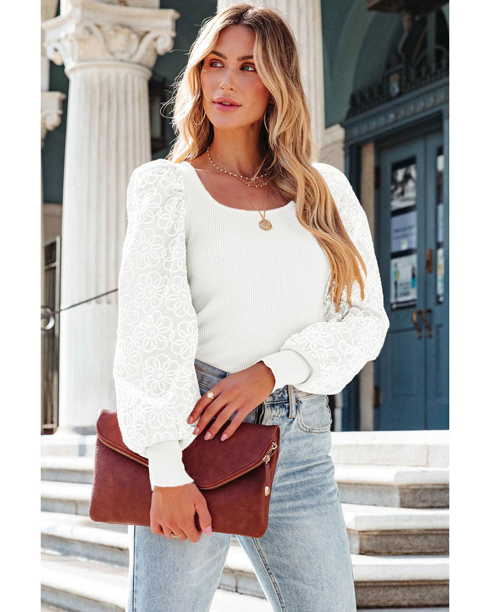 - Luxurious White Flower Puff Sleeve Ribbed Knit Top