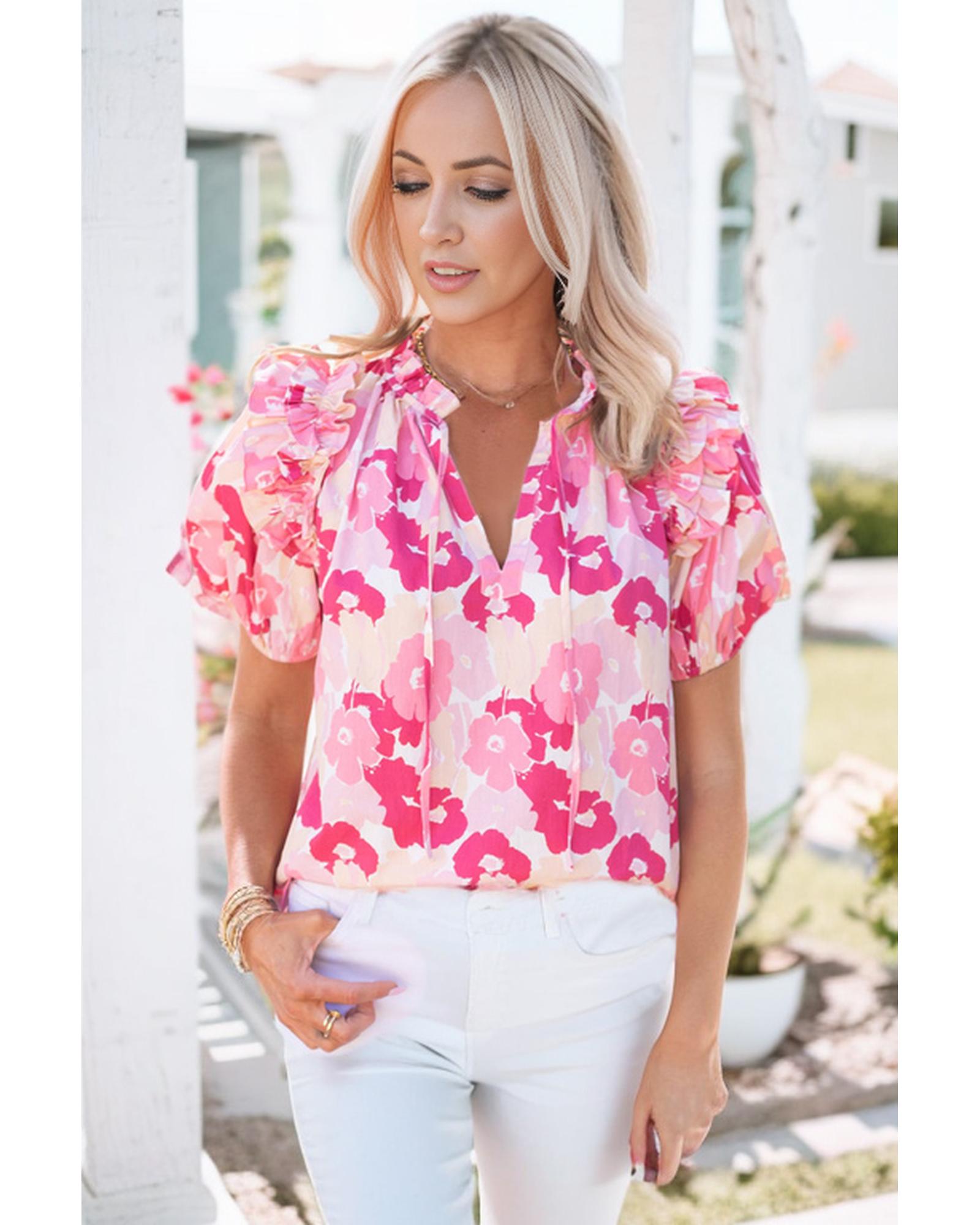 Azura Exchange Ruffled Floral Top with Split Neck and Puff Sleeves - M