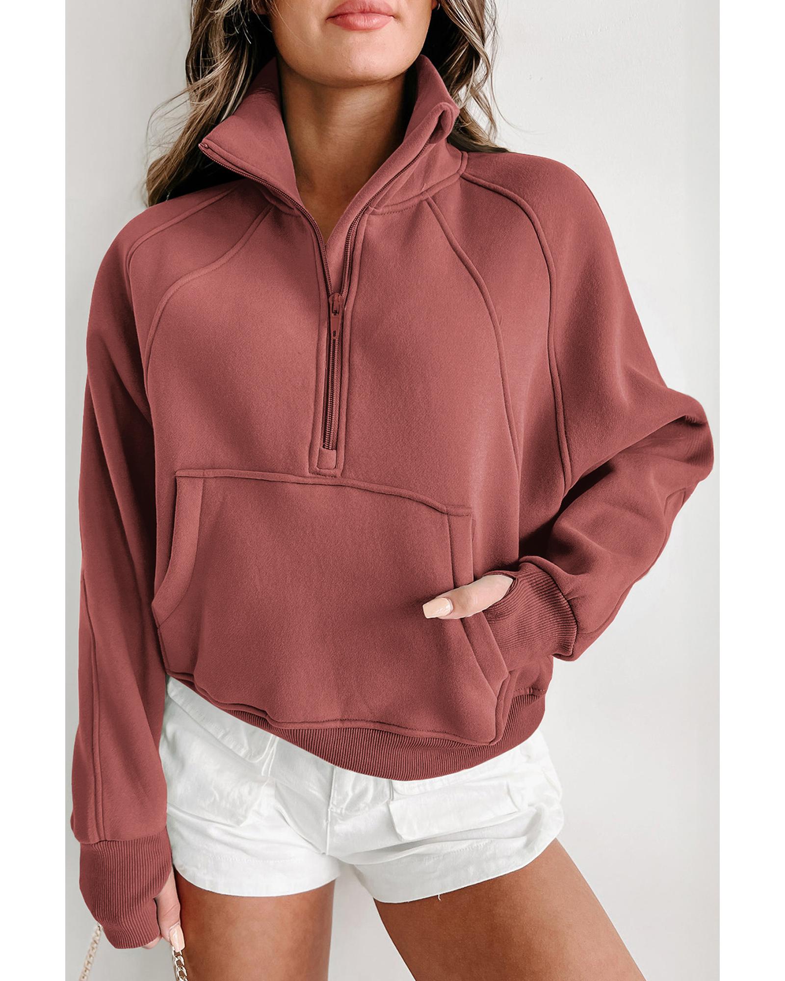 - Brown Zip Up Stand Collar Ribbed Thumbhole Sleeve Sweatshirt