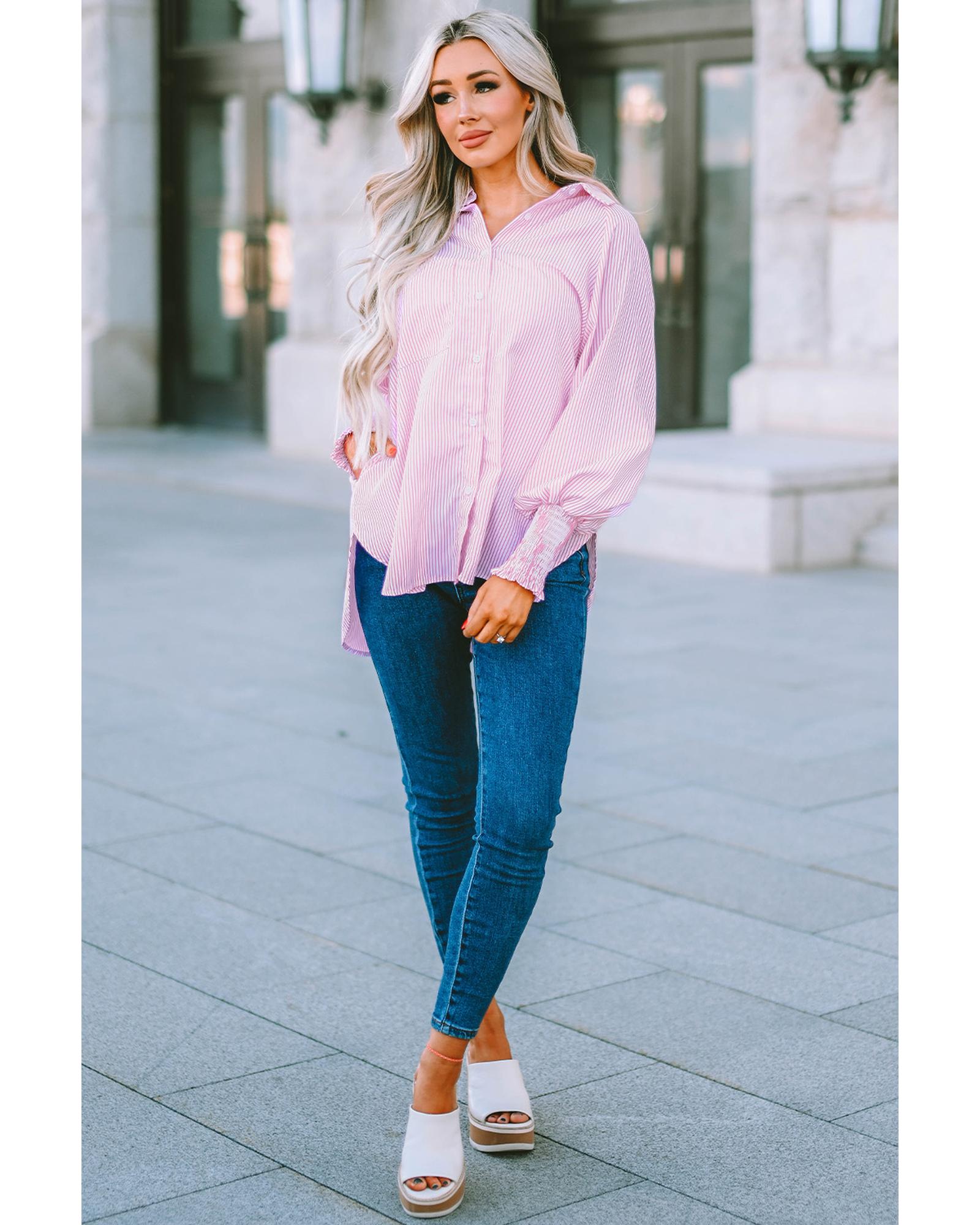 - Versatile and stylish Smocked Cuffed Striped Boyfriend Shirt with Pocket