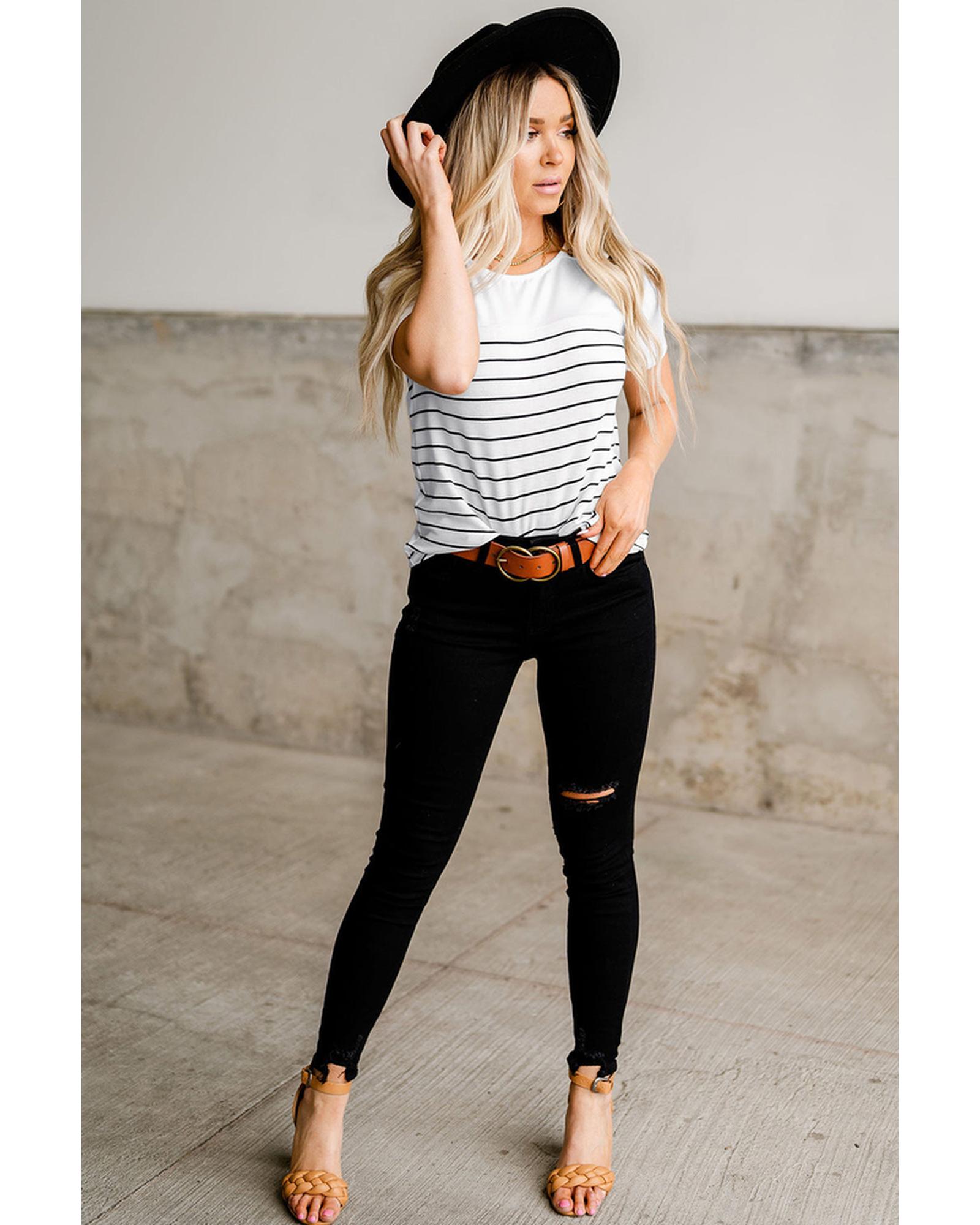 Azura Exchange Striped Buttoned Short Sleeve Top - L