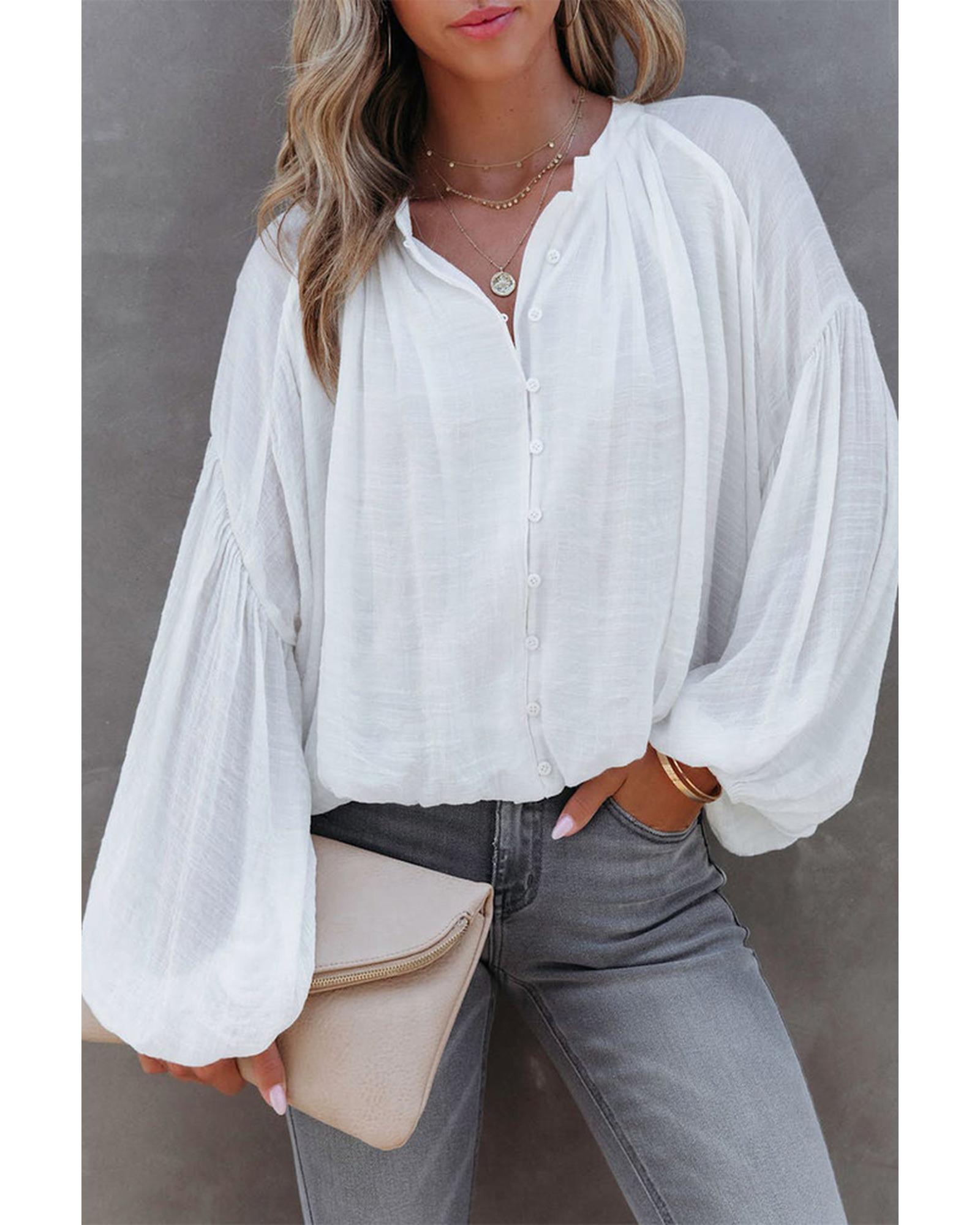 - Versatile Solid Color V Neck Balloon Sleeve Shirt