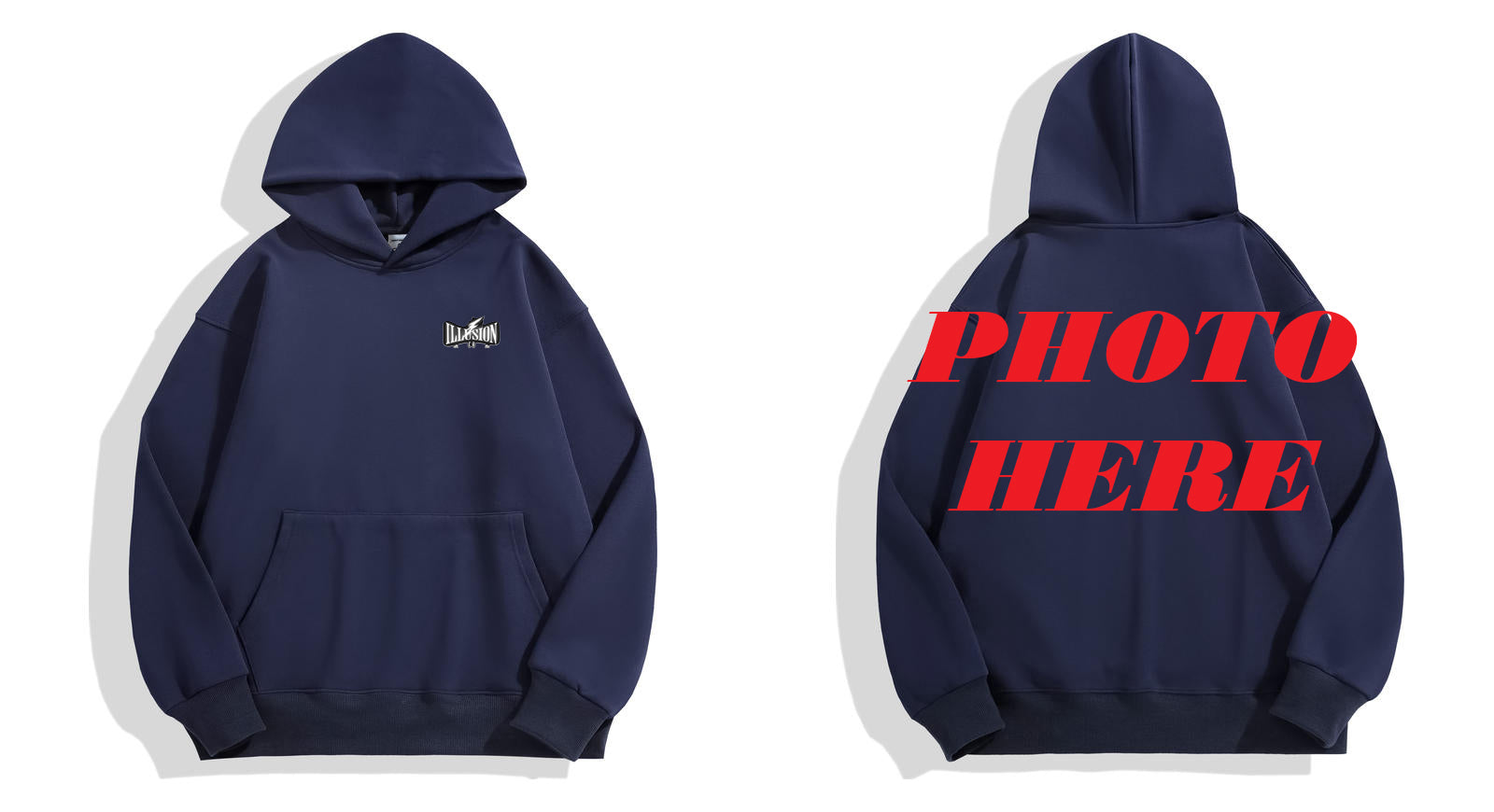 The Custom Back ILLUSION CO Front Logo Hoodie delivers exceptional warmth and distinctive style for the modern wardrobe. This premium pullover features the iconic ILLUSION CO logo prominently displayed on the front, creating an instantly recognizable statement, while the back offers a customizable canvas for your unique expression. Crafted with an impressive 500GSM heavyweight fabric blend of cotton and polyester, this hoodie provides substantial warmth and remarkable durability that maintains its integrity through extended wear, supporting your active lifestyle across changing seasons and diverse environments.