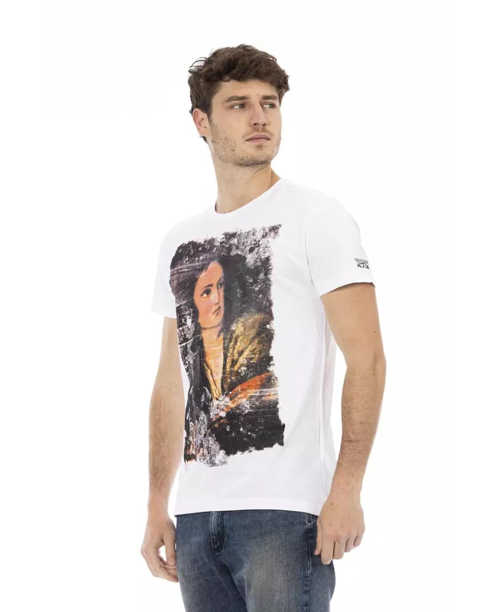 Men’s 2XL white cotton T-shirt with round neck, short sleeves, and bold front print for breathable comfort and versatile styling.