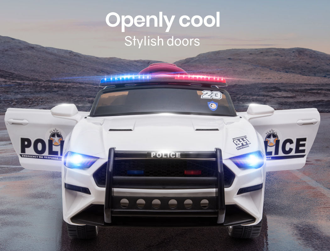 The Mustang Style Police Car features soft start which provides sensible acceleration. A 12V battery and twin motors offer unmatched range. The large wheels sport a rubber grip to stick to slippery surfaces and features a suspension to absorb harsh terrain.