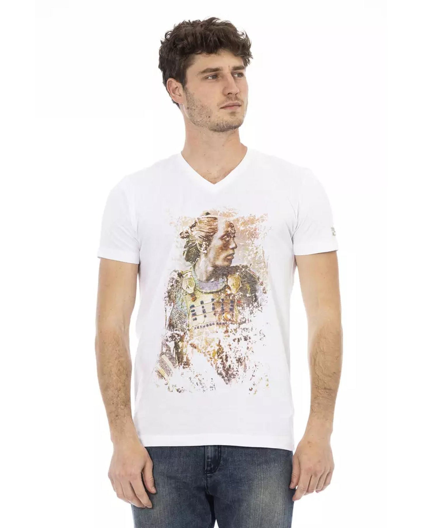 White cotton short sleeve V-neck T-shirt with front print in size L. Soft, breathable, and versatile, it offers a relaxed fit with modern styling, perfect for men who want everyday comfort paired with individuality.