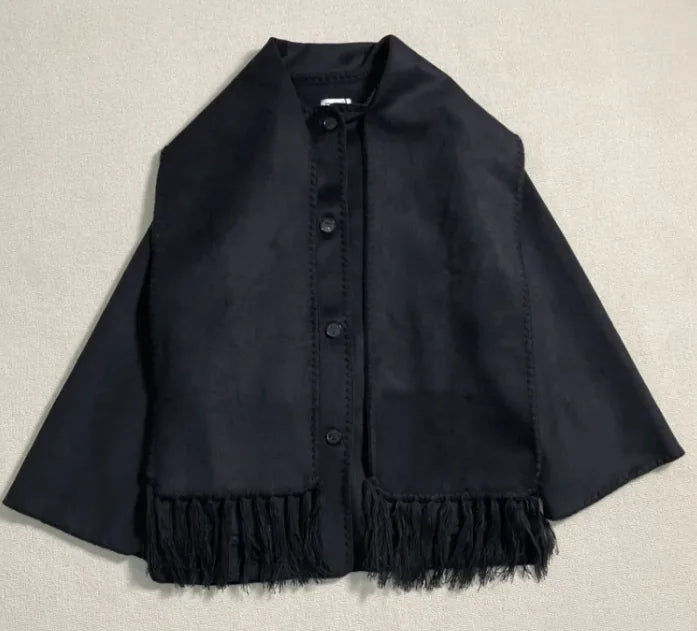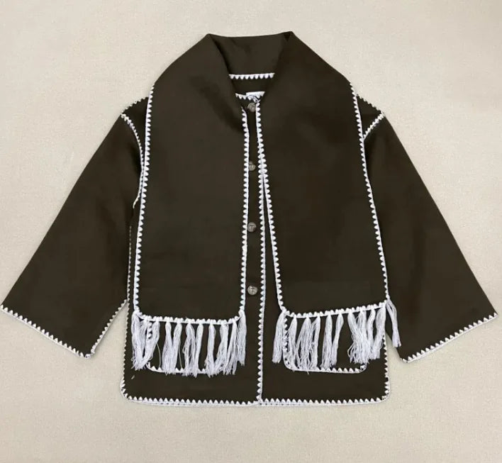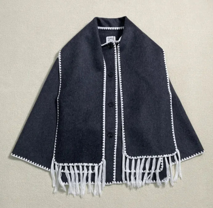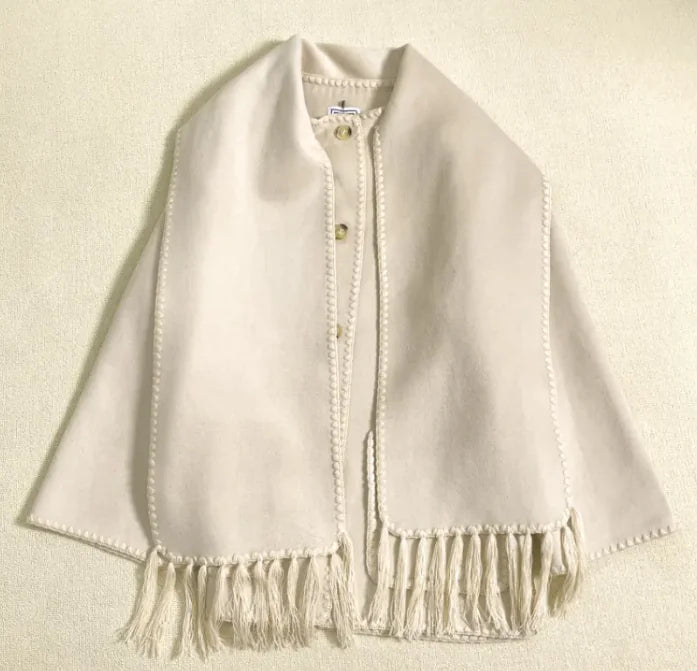 Stay warm and stylish this autumn and winter with the CozyWool wool blend coat. Featuring a chic tassel scarf collar, this loose-fit coat offers comfort, warmth, and a fashionable twist on a classic woolen design. Ideal for layering during the colder months. Embrace the chill in style with the WinterWarmth wool blend coat. Designed with a unique tassel scarf collar and a loose fit, this coat provides a relaxed, elegant look while keeping you cozy all season long. The AutumnChic woolen coat is perfect for both fall and winter. With its luxurious wool blend fabric, soft tassel scarf collar, and loose, comfortable fit, this coat brings warmth and style to your wardrobe.