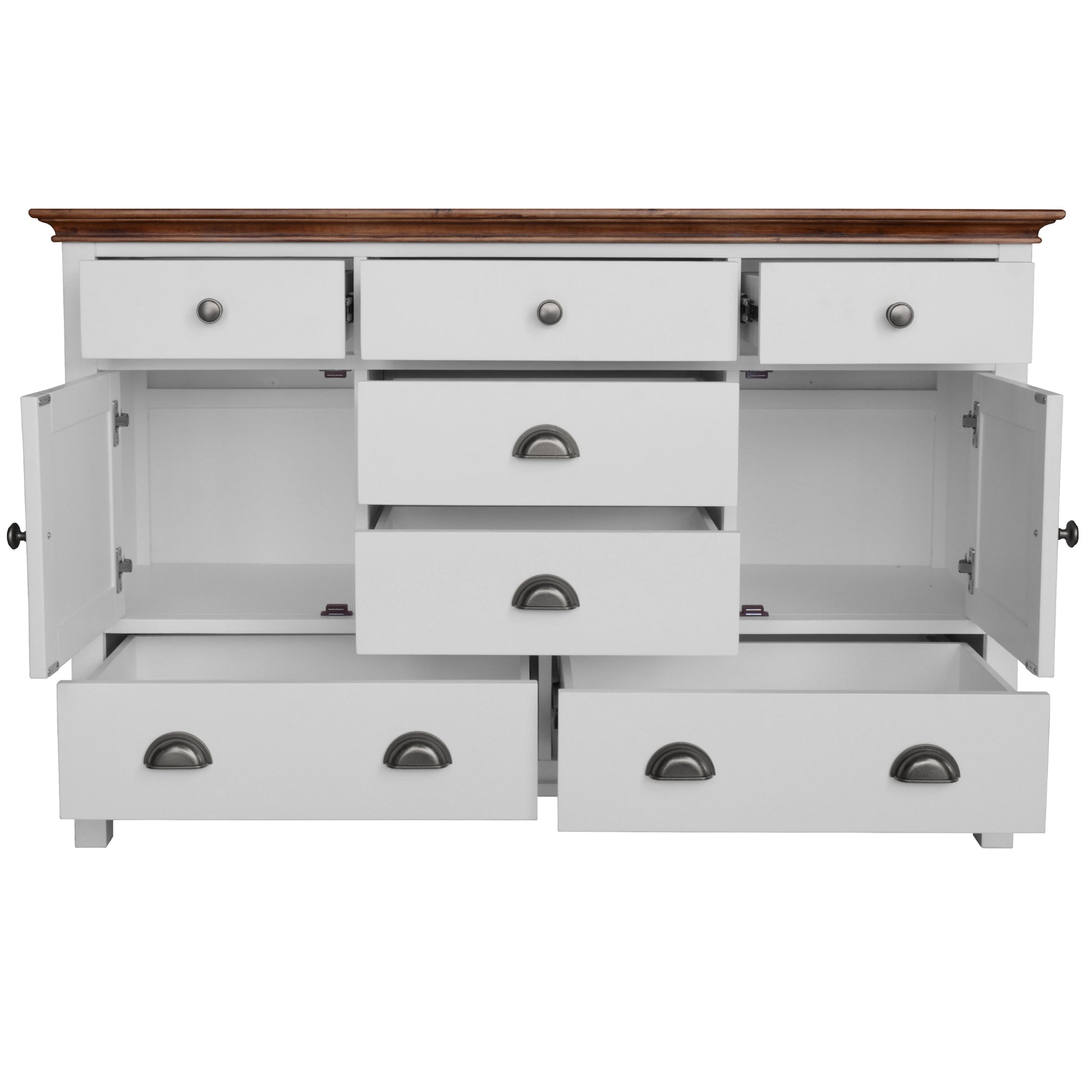 - 7 sizable drawers and 2 doors in the dresser