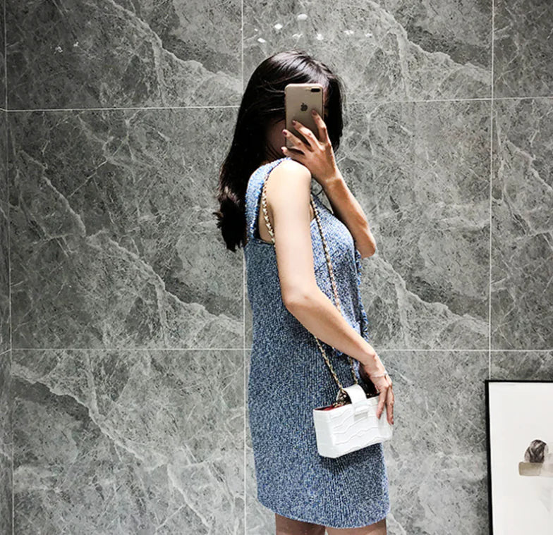 Turn heads with this pearl-strap plaid mini dress, featuring playful tassels and a flattering cotton-blend fit. Its delicate fringe hem and charming blue check pattern make it a perfect choice for warm-weather outings, casual parties, or a stylish city stroll. Available in sizes S to L.