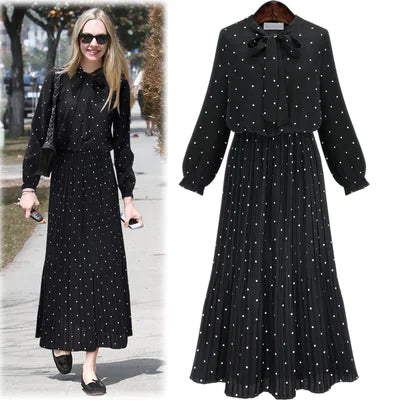 Celebrate effortless style in this flowing bohemian maxi dress, featuring a timeless polka dot print and elegant pleats. Made from soft, lightweight polyester, it offers long-sleeve coverage and a flattering fit in sizes M to 3XL. Perfect for all seasons, this dress blends comfort and sophistication in one graceful piece.